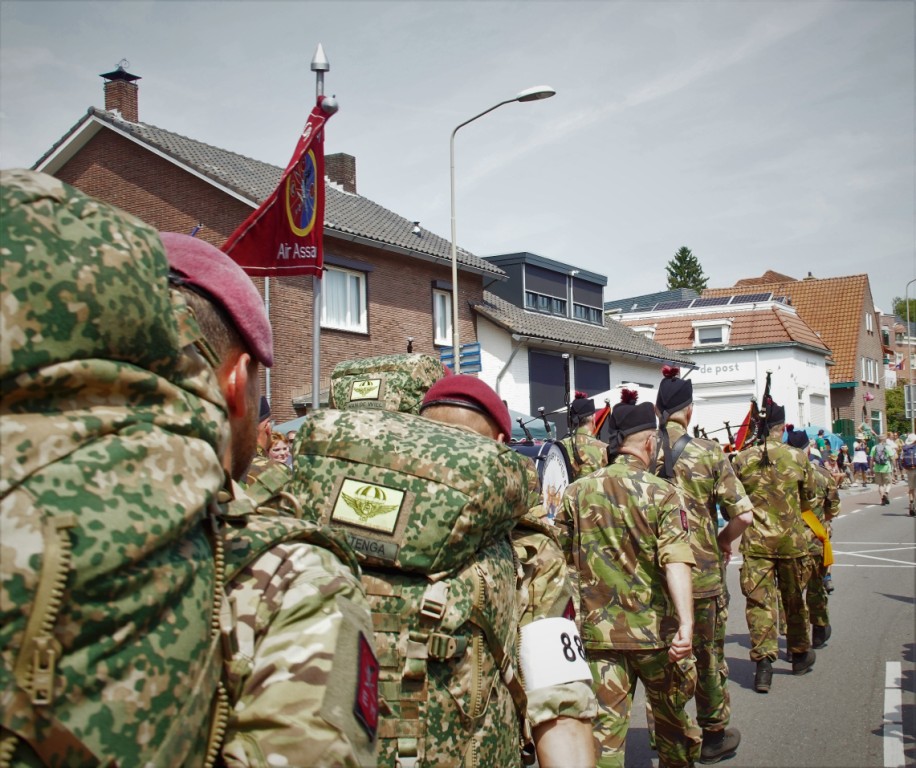 Op een druk parcours en onder veel publieke belangstelling heeft de DMPD het detachement van 11 Bevocie door Groesbeek begeleid naar de militaire rust net het dorp.