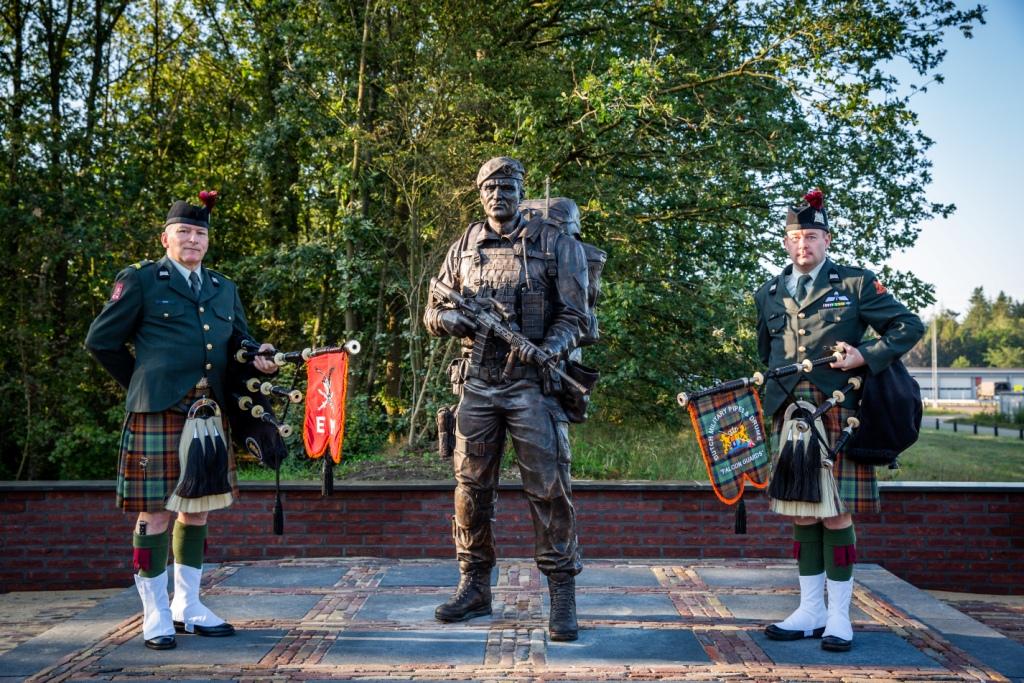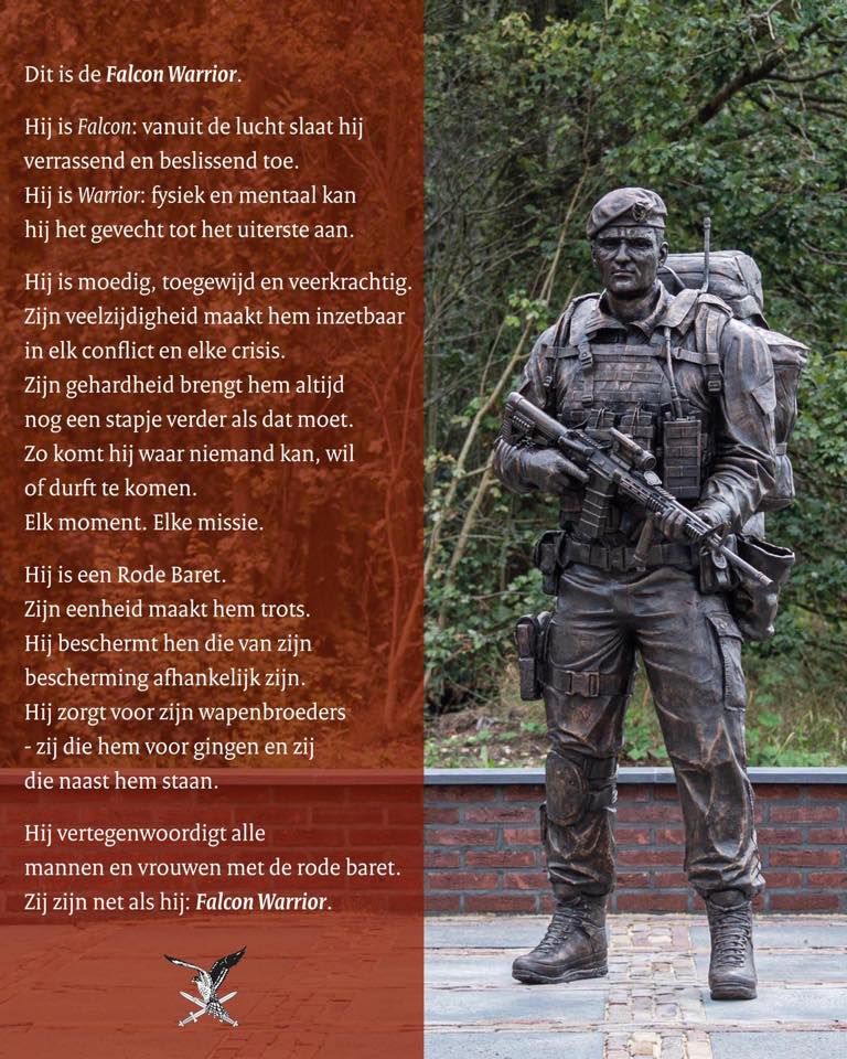 In de vroege ochtend op donderdag 22 augustus werd op de Oranjekazerne te Schaarsbergen in het bijzijn van een vertegenwoordiging vanuit de gehele 11e Luchtmobiele Brigade het standbeeld de “Falcon Warrior” onthuld. Dit standbeeld vertegenwoordigd alle mannen en vrouwen die de rode baret dragen. De onthulling werd vanuit de DMPD muzikaal ondersteund door de pipe-sergeant die tijdens de onthulling de tune “11e Luchtmobiele Brigade” speelde.