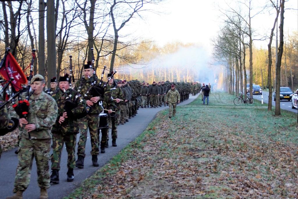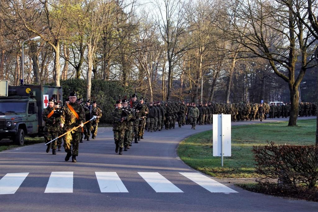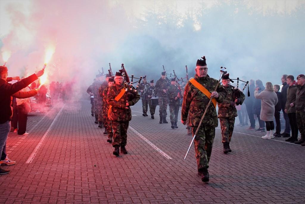 Ca. 7.30 uur vertrokken we, bij een temperatuurtje van ca. 0 graden, vanaf Echos Home “De Landing” op weg naar De Oranje Kazerne. Deze keer niet door de hoofdpoort, maar vanwege de aangepaste Covid- regels voor de poort linksaf het parkeer terrein op. Hier hadden veel familie leden zich verzameld. Sommigen al toeterend in hun auto’s, maar de meesten toch daarbuiten. Velen met felicitatie spandoeken en voetbalfakkels.