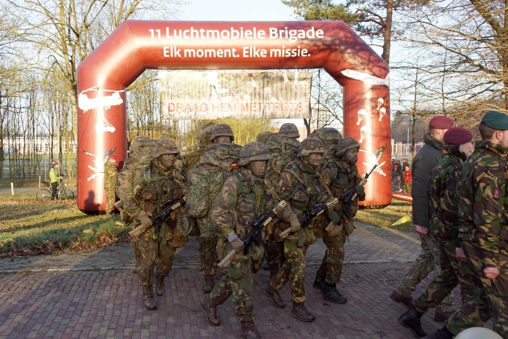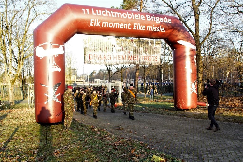 Hier vond weer de gebruikelijke intocht plaats van een grote groep cursisten (4 detachementen met in totaal 120 man (hieronder ook 3 dames!)), die de afgelopen maanden hun opleiding hebben gehad met als doel de door hen zo begeerde rode baret van de Lucht Mobiele Brigade in ontvangst te mogen nemen.