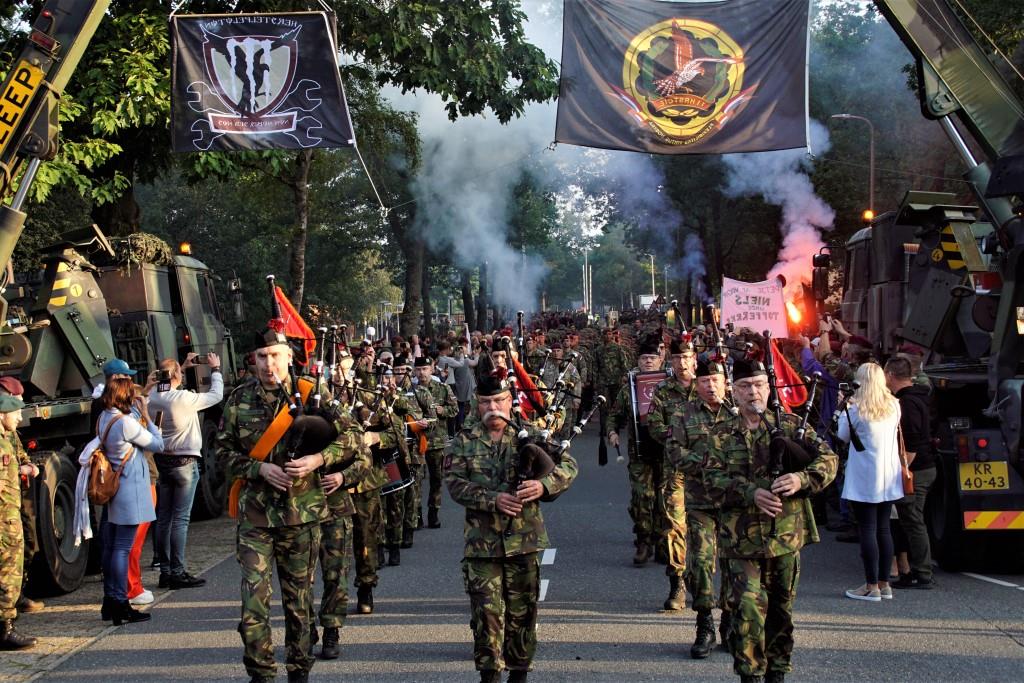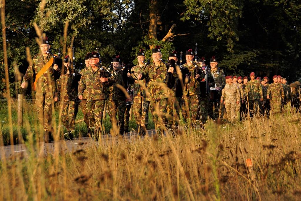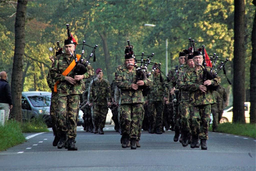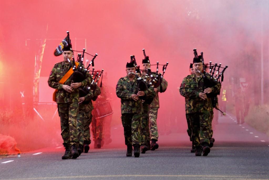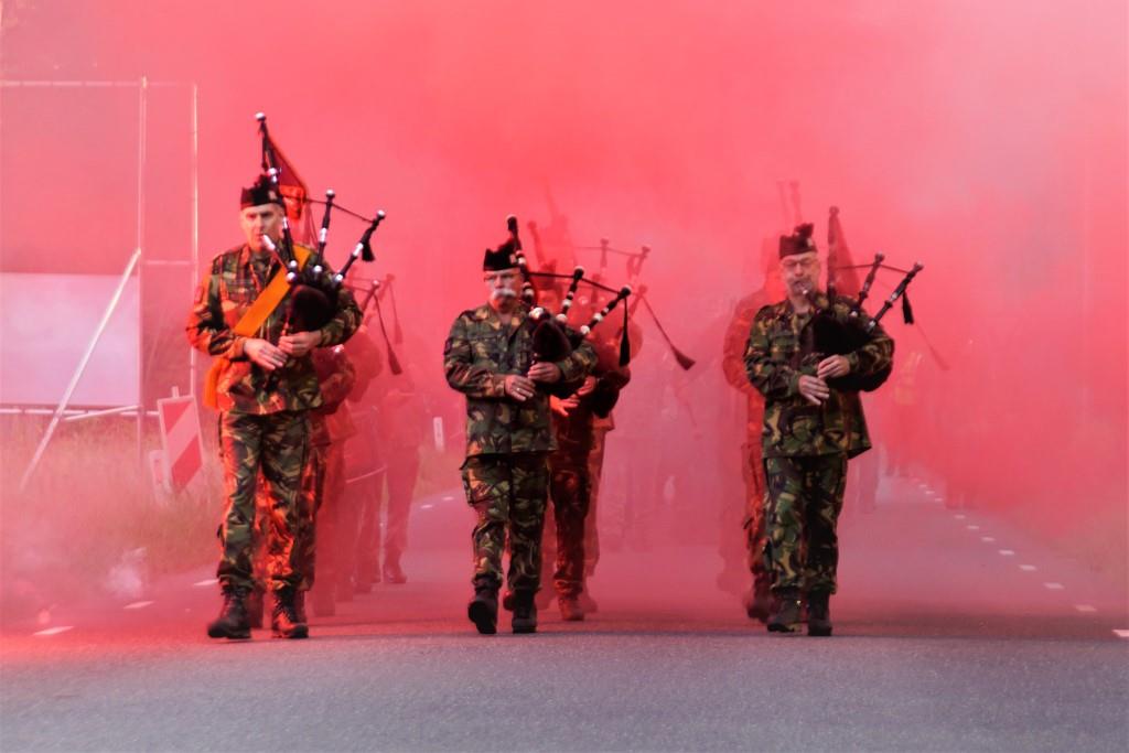 Dit is een groot grasveld langs de Koningsweg, vlak achter Echos, het punt waar we starten. Vanuit onze ervaring raken paarden in de war bij het zien van een bewegende in camouflage geklede rij personen. Het zijn vluchtdieren en dan weet je niet wat ze gaan doen. Dus spelen we niet tijdens het passeren van dat deel van de route. Het plan was om eens met slechts een klein aantal spelers daar muziek te maken. Per slot van rekening komen wij om te spelen. Deze vrijdag bleken de paarden niet aanwezig, maar de leiding van de intocht gaf ons te kennen om pas muziek te willen hebben vanaf het punt dat we voorbij het nu lege Paardenweidje waren. Achteraf een gouden zet. De cursisten die al de hele nacht gelopen hadden, ene korte ontbijtsessie hebben in Echos, moeten hun stramme spieren weer even soepel krijgen. Daar is wat tijd voor nodig, ongeveer de afstand tot aan dat punt waar we mochten beginnen met spelen. Stapvoets ging het voort. Het tempo van spelen was als vanouds, maar de staplengte een heel stuk verkleind. Zonder de vertrouwde Drum Major voorop en een ander op de plek van de Pipe Major, werden ook wij met veel applaus en rode rood verwelkomd. En wat een geluk dat een cameraman van defensie een hele mooie registratie plaatste op de facebook pagina van 11 LMB. https://youtu.be/kMsPXigdBBI En de oplettende toeschouwer had kunnen opmerken dat voor het eerst de tune Scotland the Brave niet werd gespeeld.