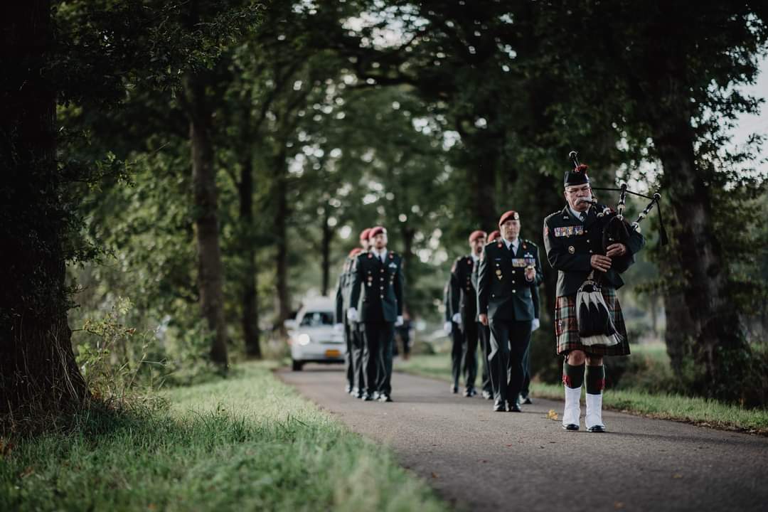 Het verzoek van de CSM aan de Falcon Guards was dan ook of wij Jeroen met de pipes willen begeleiden op zijn laatste reis naar zijn graf. Voor ons een eer om dat te mogen doen voor een veteraan.