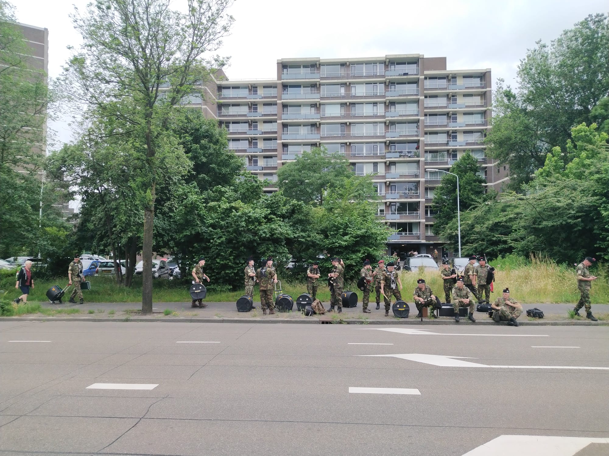 Na het inspelen en tunen is het wachten op ons vervoer naar het Malieveld. Dit had echter nogal wat voeten in de aarde. Er bleek een communicatiefout te zijn geweest waardoor er geen bus kwam opdagen. Na enkele telefoontjes werd er vanuit een naburige kazerne al snel een bus geleverd en konden we naar onze bestemming.