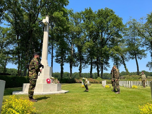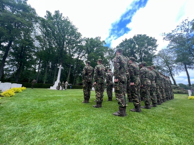 De studenten zijn maandelijks 1 week op BPV stage op de kazerne en in dit geval op de Oranje kazerne in Schaarsbergen. Tijdens de verschillende bpv stages is krijgshistorie een belangijk onderdeel, waar de studenten les in krijgen. Dit omdat het werk van een militair onlosmakelijk is verbonden met de veteranen van vroeger, maar ook de hedendaagse gebeurtenissen in bijvoorbeeld Oekraïne. Dit krijgshistories besef gebeurt op verschillende manieren zoals b.v. het bezoeken van de verschillende miltaire musea, zoals Overloon en nationaal militair museum in Soesterberg. De BPV stage week stond Market Garden en de slag om Arnhem centraal met als locatie de militaire begraafplaats in Oosterbeek. De studenten bereiden een presentatie voor en geven deze op locatie aan elkaar onder een begeleiding van de militaire instructeurs. Waarna als afsluiting en onder toeziend oog van de humanistisch raadvrouw van school luchtmobiel de studenten een kranslegging houden bij monument op de begraafplaats. Tijdens dit moment van herdenken heb ik op de doedelzak het stuk Highland Cathedral ter gehoren mogen brengen. Een kort moment maar een moment wat door veel studenten, maar ook de instructeurs als zeer indrukwekkend wordt ervaren. Voor mij als beginnend speler bij de Falcon Guards een mooi moment. Natuurlijk als eerste dat ik door het spelen op de doedelzak respect mag laten blijken naar de gevallen militairen zowel van de tweede wereldoorlog als de militairen die in latere missies zijn omgekomen.