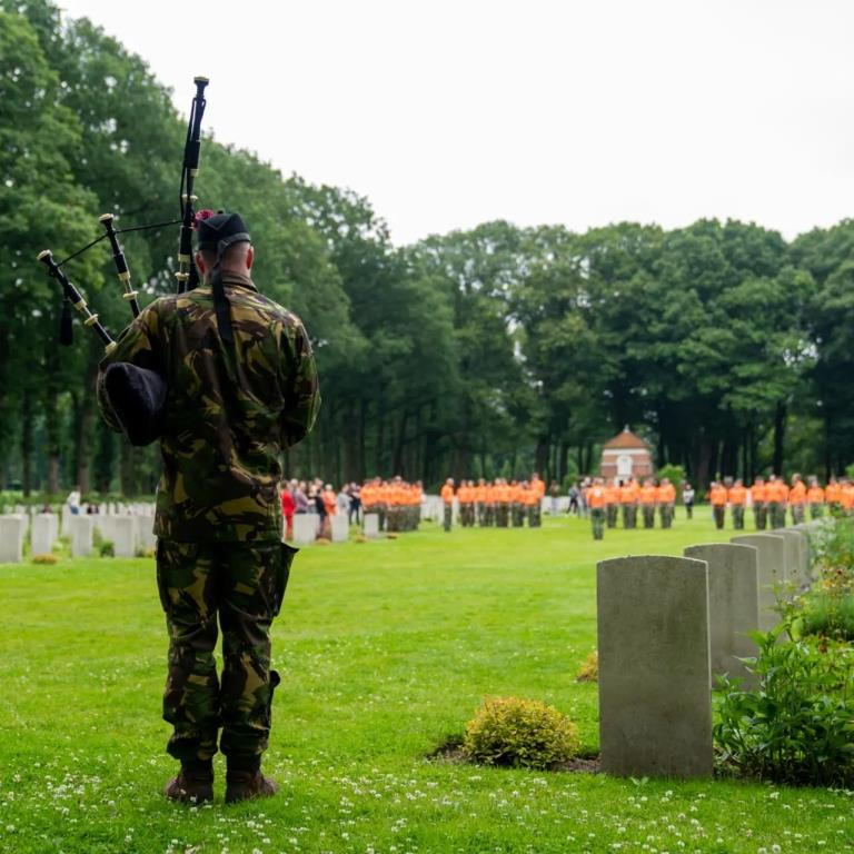 Bij de ceremonie op begraafplaats Oosterbeek speelde een van onze pipers. De Veva bedankt de Falcon Guards voor de muzikale bijdrage.