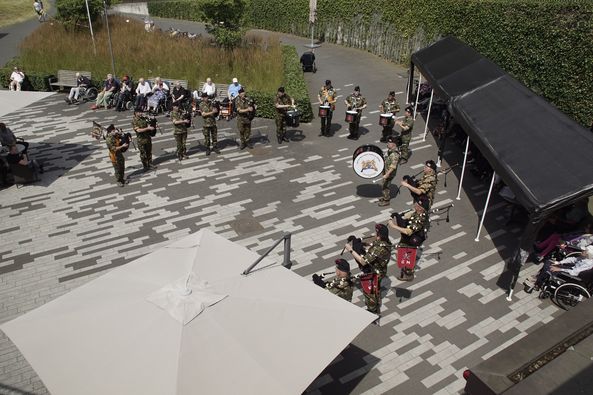 Nadat het wandeldetachement de rustpost weer verlaten had, zijn de Falcon Guards doorgereden naar een zorginstelling tussen Groesbeek/Nijmegen. Aldaar hebben zij enkele muziekstukken gespeeld voor de bewoners en personeel. Zo hebben we de mensen een leuk moment in de middag mogen geven. Dankbaar dat we dit voor ze mochten doen.