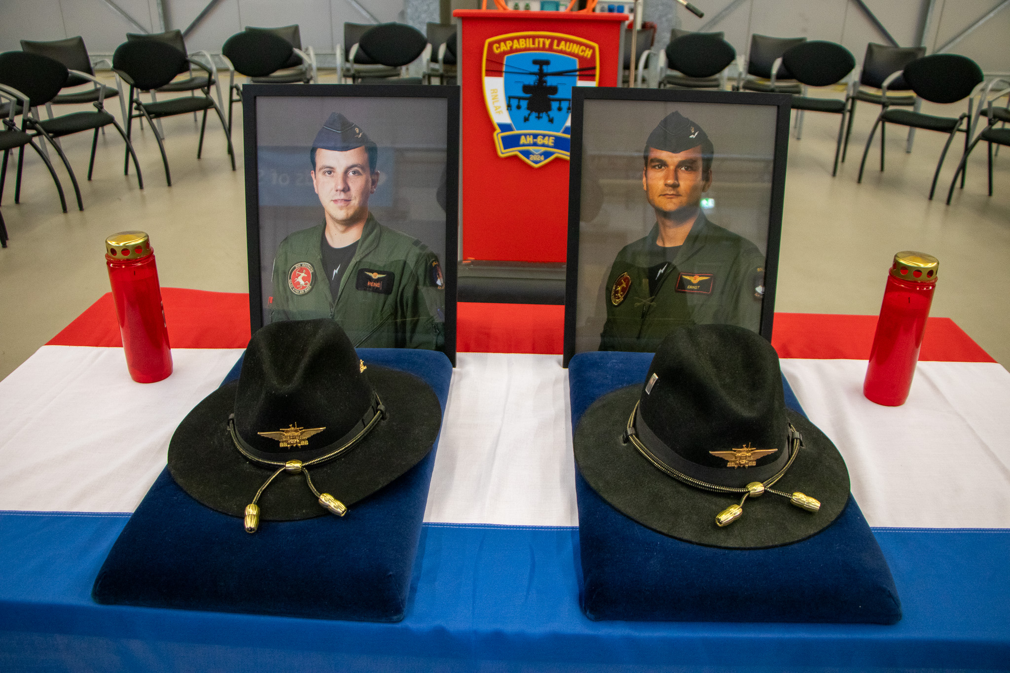 Nu 10 jaar later kwam van Luna (call sign) de vraag of die piper van toen wederom kon spelen tijdens de herdenking. Dat was niet mogelijk, maar een vervanger werd gevonden. In een hangaar waar normaliter Apache helikopters staan, stond een tafel waarover de Nederlandse vlag lag uitgespreid. Daarop stonden de foto’s van de beide vliegers. Hun zwarte Stetson hoed lag ervoor, het officiële hoofddeksel van diegenen die binnen het 301 Squadron betrokken zijn bij de Apaches.